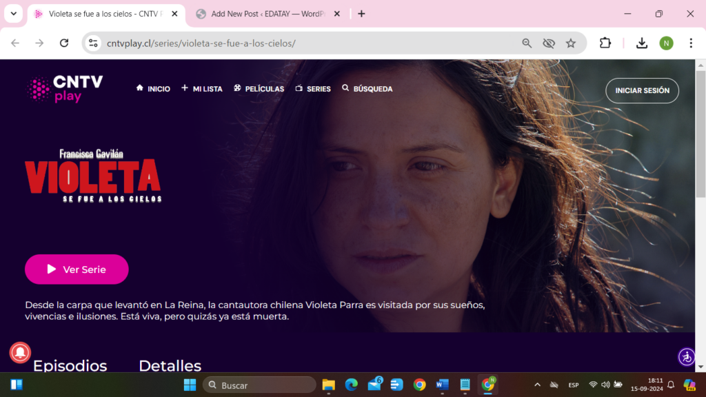 Lo primero que haremos para realizar nuestra composición escénica es investigar todo lo que hay ya sobre la cantautora. Por ejemplo, estaré mirando esta serie llamada «Violeta se fue a los cielos», que tu también puedes ver de forma gratuita en la web de CNTV. Esto puede ser un disparador creativo para la creación y nos ayuda a conectarnos y sensibilizarnos con el tema que estaremos danzando.